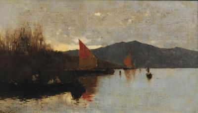 River Scene at Dusk with Boats and Figures