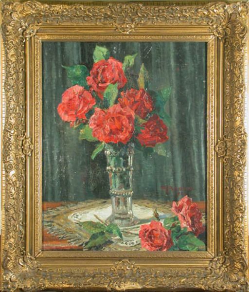 | Prächtiger Strauß von dunkelroten Rosen in einer alten Stangenvase vor einem grünen, gefältelten Vorhang | |