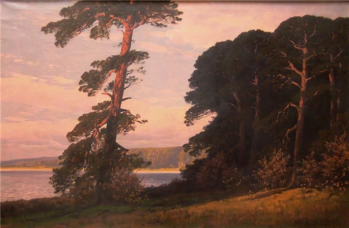 Märkisches Seeufer mit Kiefern in der Abendröte.