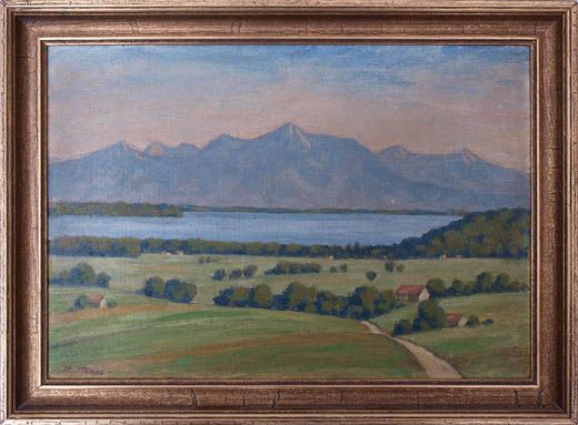 Summer landscape by a lake in the background, the mountain ranges of the Alps