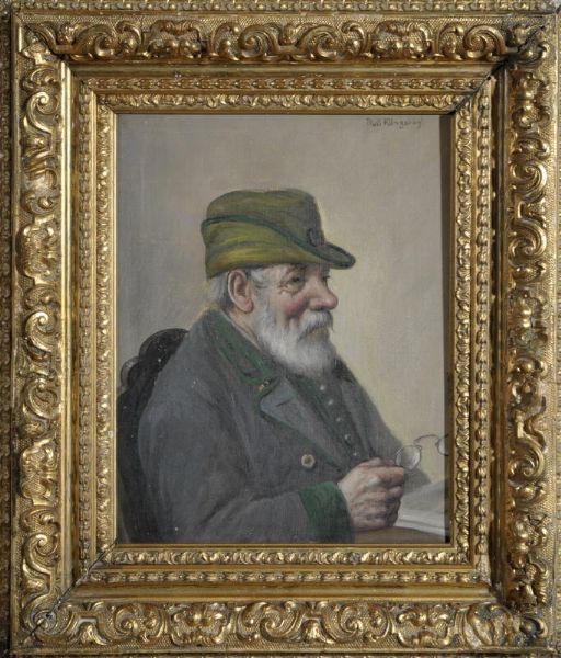 Portrait eines Jägersmannes am Tisch sitzend mit Lesebrille