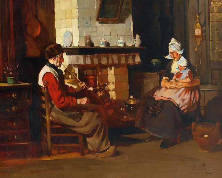 Interieur einer holländischen Stube; vor dem Kamin sitzendes Paar mit Kleinkind