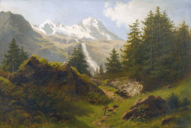Gebirgslandschaft mit Hirt und drei Schafen.