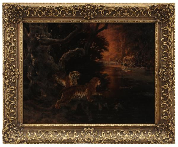 | Tigers Stalking, jungle landscape with two tigers under a baobob tree | |