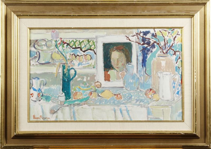 Stilleben med porträtt och vaser