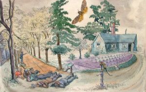 Humorous WWII scene depicting an ARP Warden, figures and a butterfly by a country cottage