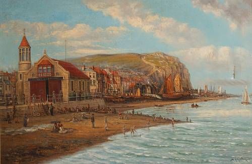 A view of Whitby, with lifeboat station, and figures on the beach to the foreground