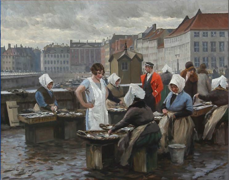 Fishermens' wife selling fish at Gl. Strand in Copenhagen.