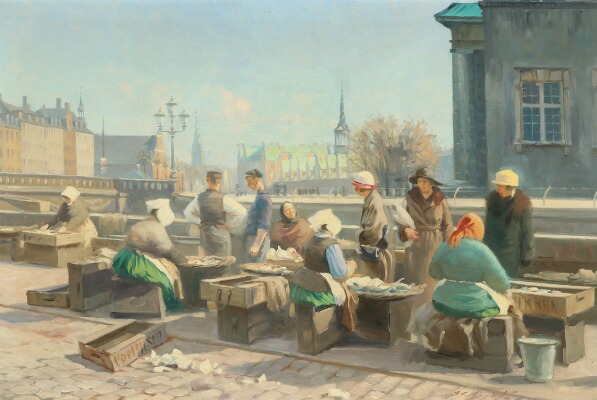 Women selling fish at Gammel Strand on a sunny day.