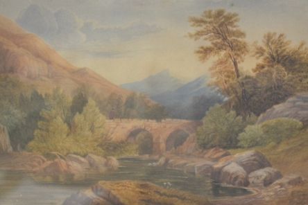 Figure on a bridge over a river in mountainous landscape