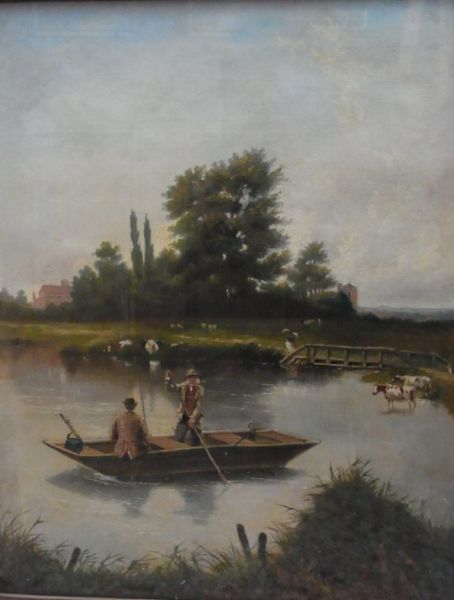 Fishing from a punt on a sunny afternoon, cattle watering beyond