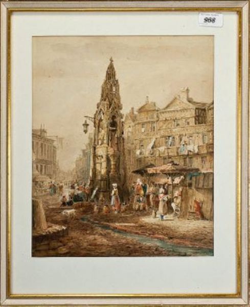 An Old Town in Normandy, a market square by a central water fountain church monument