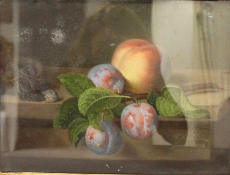 "Plums, peaches and nest on an entablature"