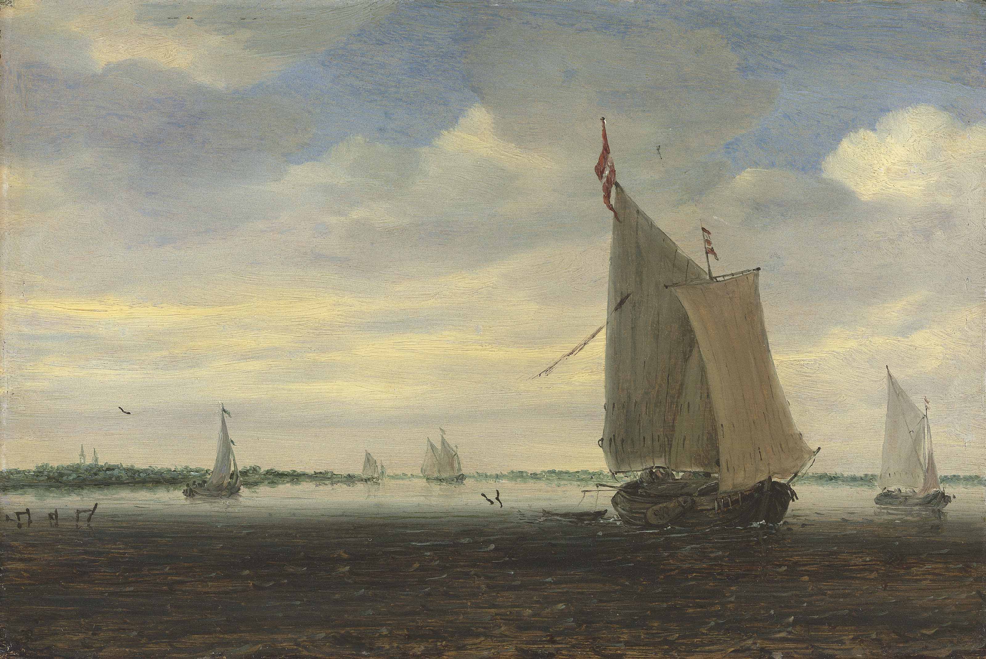 | A wijdship and other small Dutch vessels on an estuary, a church beyond | |