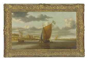 | An extensive river landscape with two vessels and other boats, a church beyond | |