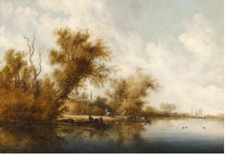RIVER LANDSCAPE WITH FIGURES ON A FERRY