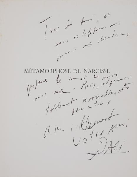 | Ink Dedication and autograph on paper. Written on a page of the book "Métamorphose de Narcisse". Paris | |