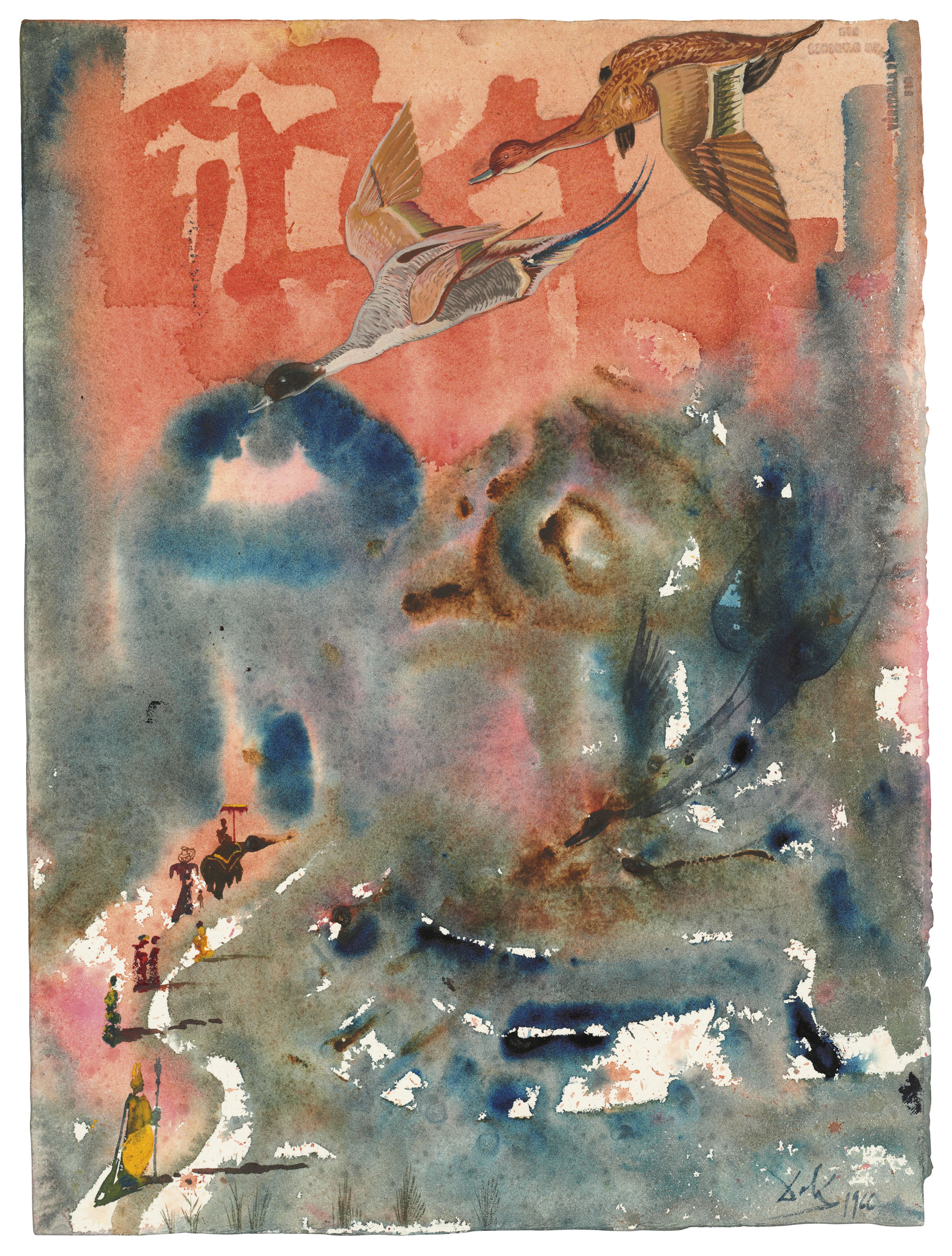 Oil gouache, watercolour and brush and coloured ink on paper