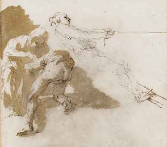 | A sailor hauling on a rope, and two other figures, perhaps a doctor and patient | |
