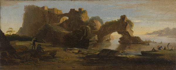 PAESAGGIO COSTIERO CON VIANDANTI E PESCATORI