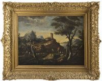 Capriccio landscape with fishermen, sheep and goats grazing on a river bank, a fortress in the distance