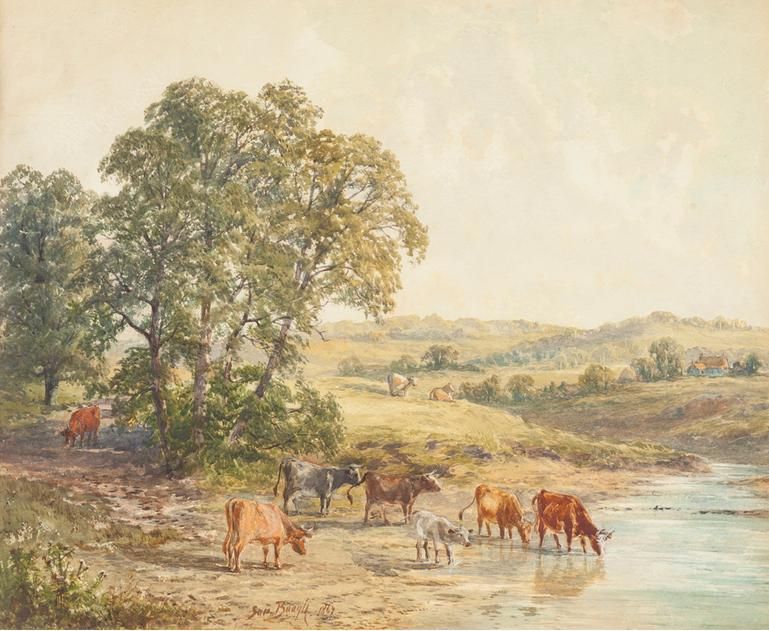 A RIVER LANDSCAPE WITH WATERING CATTLE