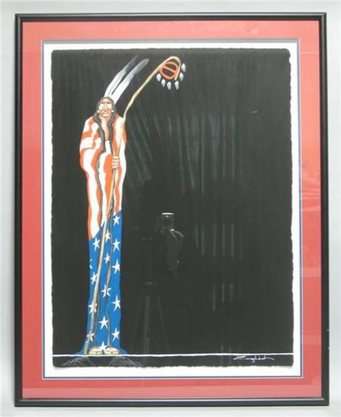 NATIVE AMERICAN WRAPPED IN AMERICAN FLAG