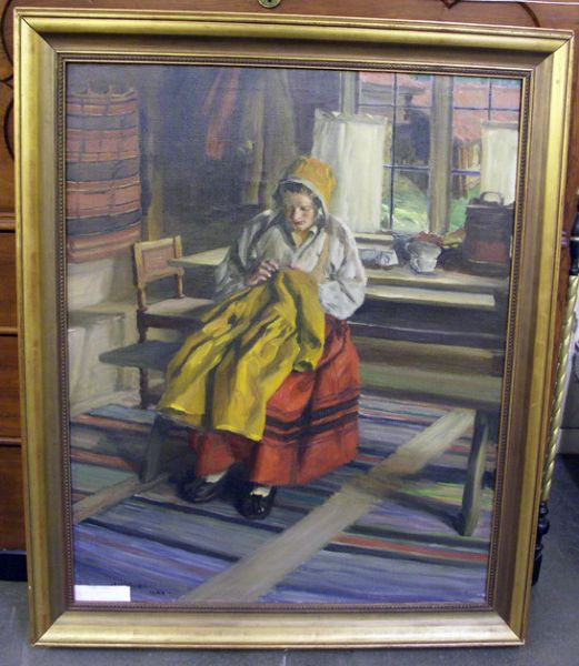 Motiv av broderande dalkulla i stuginteriör.