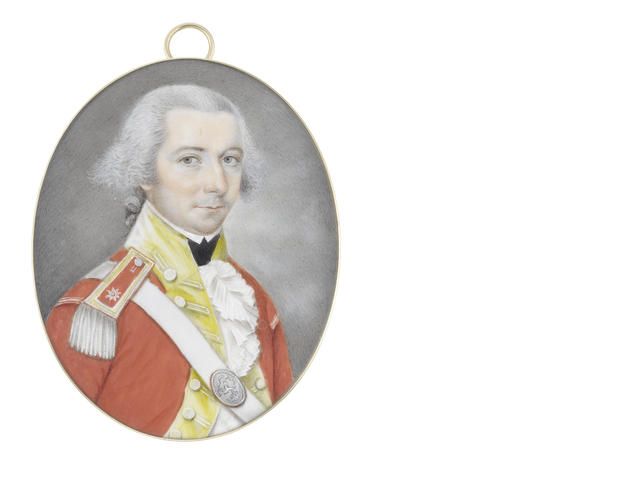 | An Officer, wearing scarlet coat with yellow facings and silver epaulettes, white waistcoat, frilled chemise and black stock, wh | |