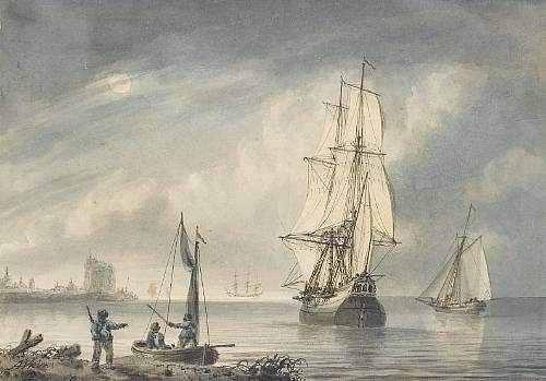 | A bilander and smaller craft offshore in a light breeze, with an anchored three-master beyond; A frigate preparing to anchor in | |