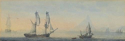 | A brig under reduced sail and with her topmasts down heading inshore, with Mediterranean xebecs in the bay | |
