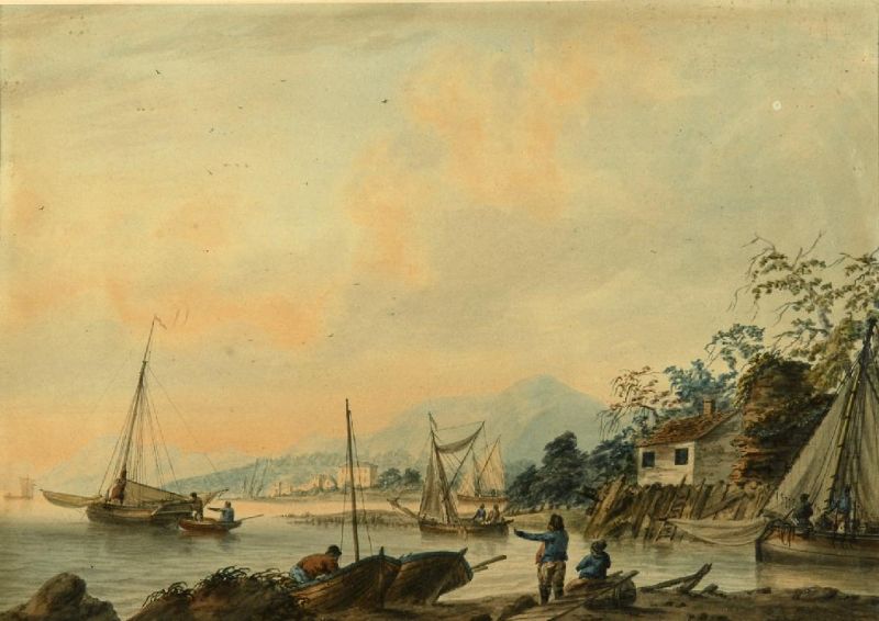 ESTUARY SCENE WITH FIGURES AND BOATS