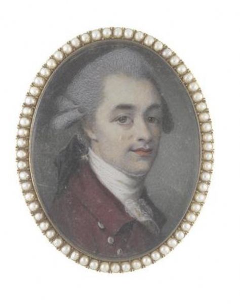 | A Gentleman, wearing crimson coat, white stock and lace cravat, his powdered wig worn en queue and tied with a black ribbon bow. | |
