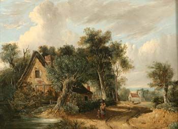 | Norfolk Landscape with Figures by a Cottage and Church Beyond, | |