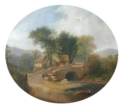 Two girls sitting on a packhorse bridge, a fisherman on the river bank