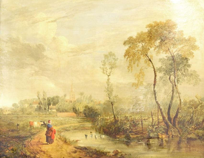 | River landscape with a lady on a path, cattle and ducks nearby, village and church beyond | |