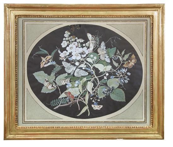 | A pair of George II basso-relievo gouache still life of moths and foliage | |