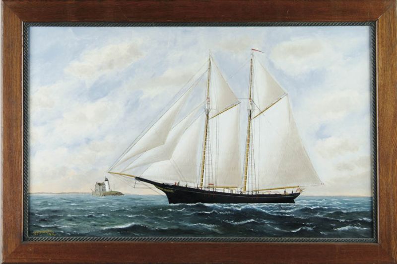 | Oil on canvas ship portrait of the schooner "Fred Gray". Two-mast black hull schooner sailing left to right with five figures aboard | |
