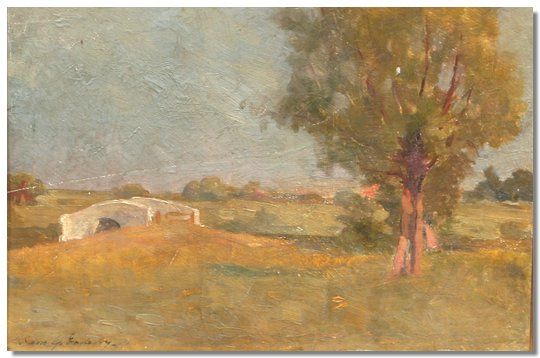 Landscape with trees, arched bridge and a village beyond