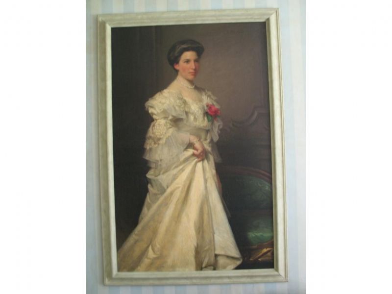 | A portrait of Emma Louise Hamilton standing three-quarter length in an interior wearing a diamond necklace and a red rose in her | |