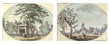 | Figures at a pond, a cottage and village beyond; and A lady and a traveller on horseback, beside a well | |