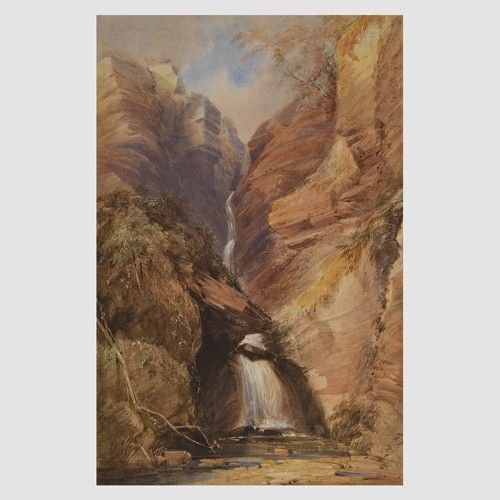 A WATERFALL IN A MOUNTAINOUS LANDSCAPE