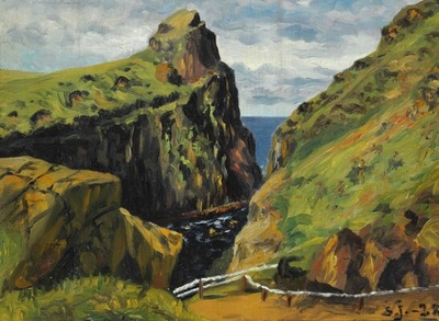View towards the bridge to Mykenes Holmen, the Faroe Islands. Signed S.J.-28. Oil on board. 25×34 cm. | |
