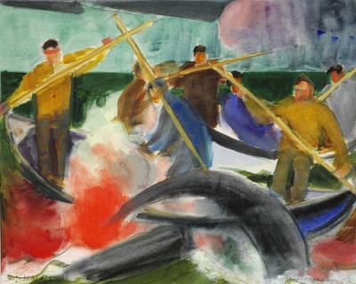 Whale killing scene, the Faroe Islands. Signed S. J. Mikines Grindadráp 68. Watercolour on paper. Visible size 56×70 cm. | |