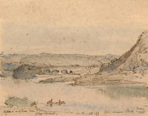 Lake scene with distant bridge.