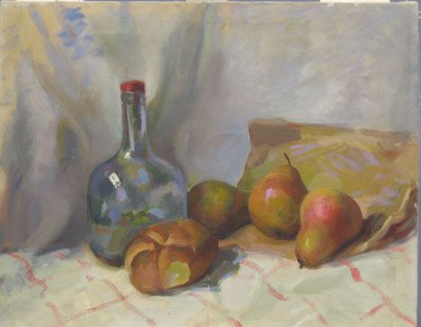 STILL LIFE WITH BOTTLE, BRAD AND PEARS