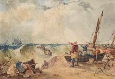 A Stormy Beach Scene, Fisherfolk on A Shore, Coastal Shipping in Distance