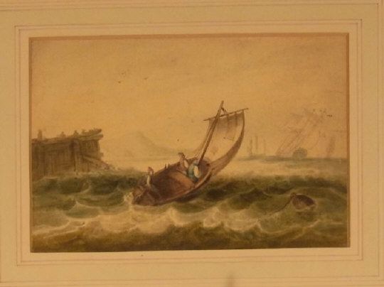 Fisher folk embarking from a jetty in a choppy sea, a man-o'-war in the distance