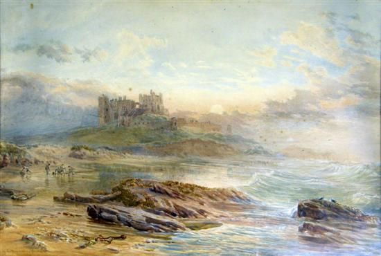 coastal scene with figures and a ruined castle