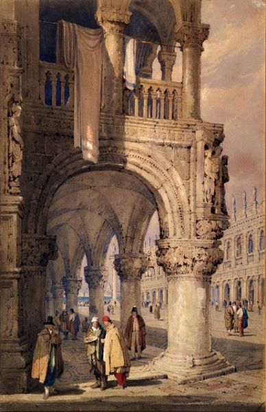 | View of St. Mark's Square, Venice, with figures in arched portico to foreground and Grand Canal to background | |